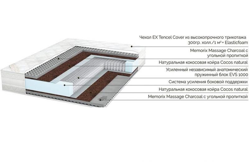 Королевский матрас с микромассажным эффектом. Адсорбирующий меморикс высокой плотности, с угольной пропиткой, обладает эффектом «массажного облака», а также независимый, чувствительный пружинный блок (более чем 1000 пружин на спальное место) и слой натурального кокоса подарят достойный уровень комфорта и естественного оздоровления в процессе сна.